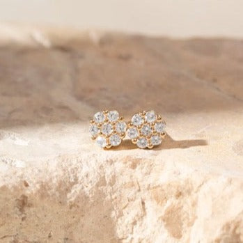 Discover elegance with our AMELIA EARRING - SMALL. Crafted with 18K gold filled material, these delicate earrings feature a small light point flower design adorned with brilliant white zirconia. Perfect for adding a touch of sparkle to any outfit.